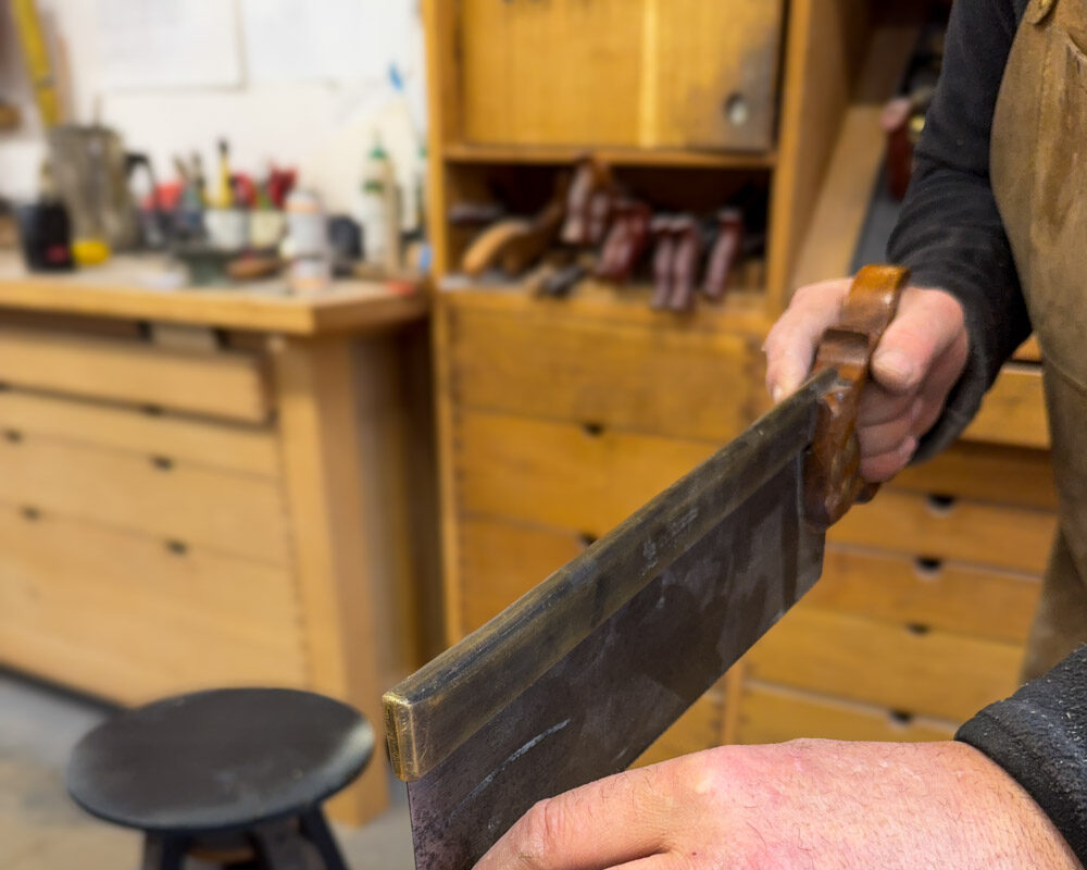 Ja zwykle robię to używaną grzbietnicą, którą kupiłem na pchlim targu w Londynie. Z zachodnich modeli to właśnie grzbietnice najbardziej nadają się do tego zadania. Grzbiet piły usztywnia ją i daje większą kontrolę nad procesem cięcia. Moja piła ma 12 zębów na cal, jest przeznaczona do cięcia wzdłużnego, ale sprawdza się również do cięcia poprzecznego więc wszystkie operacje wykonuję tym samym narzędziem.